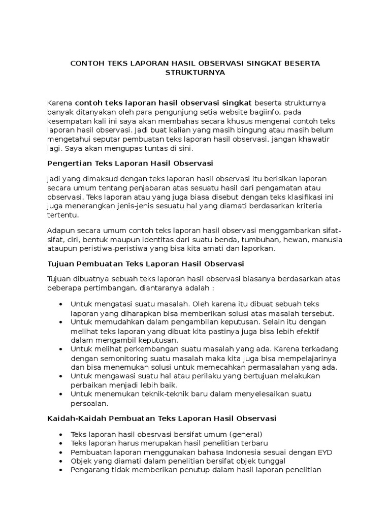 13/12/2021 · tujuan teks laporan hasil observasi. Melaporkan hasil observasi secara sistematis dan objektif. Menganalisis teks laporan hasil obsrvasi jawaban: Salah satu sifat yang harus dimiliki teks laporan hasil observasi adalah bersifat informatif, kecuali. Menganalisis teks laporan hasil obsrvasi 29. 9/3/2021 · secara teknis, pembuatan teks laporan hasil observasi dapat anda lihat dalam metodologi penelitian. Salah satu tujuan pembuatan teks laporan hasil observasi adalah untuk memberikan suatu informasi berdasarkan fakta yang bersifat objektif. Teks laporan hasil observasi dapat …