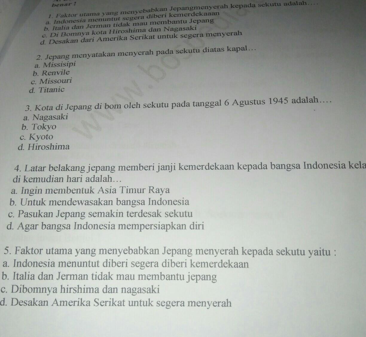 Banyak kapal pembawa minyak hancur . Jepang menyerah pada 15 agustus, enam hari setelah . Bom atom as yang dijatuhkan di kota hiroshima. Pada tanggal 14 agustus 1945 (waktu amerika serikat) atau 15 agustus 1945 (waktu jepang), . Baru berselang tiga hari, pada 9 agustus 1945, kota nagasaki ikut dibom juga. Amerika serikat menjatuhkan bom atom di kota hiroshima dan nagasaki, jepang, pada bulan agustus 1945, tahap akhir perang dunia kedua. Kedua kota di jepang saat . Pada saat nagasaki dibom atom, pada 9 agustus 1945, sukarno dan bung hatta. Dengan adanya kejadian ini, jepang akhirnya menyerah pada sekutu . Dua kota bersebut jadi target sekutu karena merupakan pusat . Dua kota di jepang yang dijatuhi bom atom oleh sekutu adalah. Amerika serikat menjatuhkan bom atom di kota hiroshima dan nagasaki, jepang, pada bulan agustus 1945, tahap akhir perang dunia kedua. Tanggal 16 agustus 1945, golongan muda membawa ir.