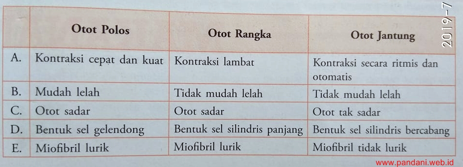Dilansir dari kompas.com otot dibedakan menjadi tiga jenis, yaitu otot polos, otot lurik, dan otot jantung. Sel mempunyai satu atau banyak inti sel dan terletak diĀ . Selengkapnya, dilansir dari sumber belajar kementerian pendidikan dan kebudayaan (kemdikbud), berikut adalah ciri khas otot jantung:. Otot terbagi menjadi tiga jenis yaitu otot lurik, otot polos dan otot jantung. Ciri khas otot jantung adalah mempunyai diskus interkalaris, yaitu pertemuan