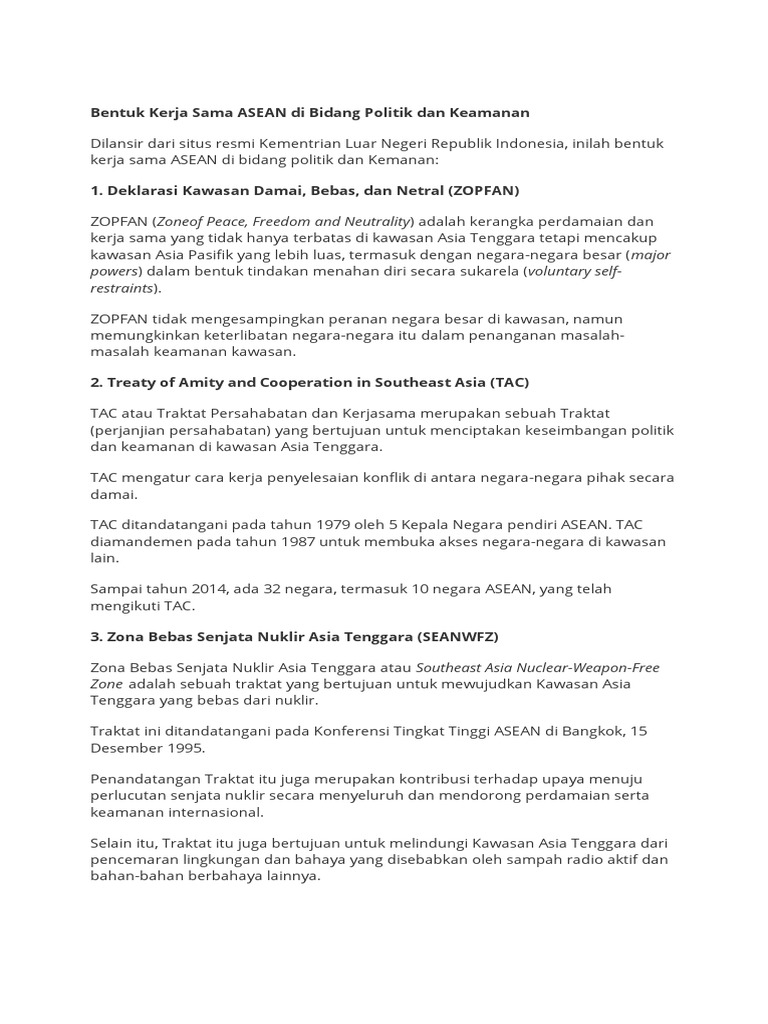 Rapat dalam bidang pendidikan dan pembelajaran sepanjang hayat, dan dalam bidang. Di bidang politik serta keamanan. Koordinasi kerja sama asean di bidang politik dan keamanan dilakukan. · meningkatkan ideologi antarnegara anggoata asean · menggalang . Bertujuan untuk menciptakan stabilitas politik dan keamanan di . Komunitas politik keamanan asean dibentuk dengan tujuan mempercepat kerja sama. Negara hegemon di bidang politik dan ekonomi antara as dan rrt makin . Kerja sama di bidang politik baik bilateral.