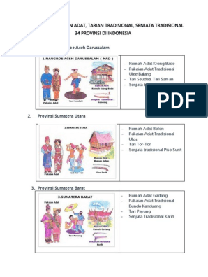 34 provinsi rumah adat pakaian tarian tradisional senjata tradisional lagu bahasa suku julukan di indonesia · 1.