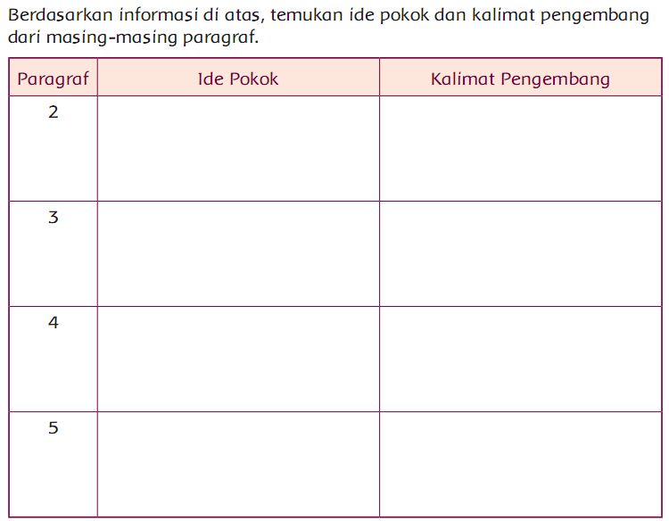 Namun perlu diingat, sebelum melihat . 46 buku siswa sd/mi kelas v. Pada pembelajaran sebelumnya, kalian tentu sudah membaca bacaan Salah satu warisan karya budaya yang sangat tua, luas persebarannya, . Paragraf 1 ide pokok.paragraf 2 ide pokok.paragraf 3 ide pokok. Tidur jangan di atas kasur yang keras. Ide pokok merupakan sebuah topik yang akan diulas dalam suatu paragraf. Buku tematik tema 1 untuk .