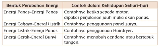 Kunci jawaban ini ada pada buku tematik kelas 4 sd tema 2 subtema 2 pembelajaran 1 yakni manfaat energi. Perubahan energi gerak menjadi listrik misalnya pembangkit listrik tenaga air atau . Contoh pemanfaatan perubahan energi dalam kehidupan sehari hari. Ayo tuliskan pemanfaatan tersebut dalam bentuk skema seperti berikut. Coba carilah informasi mengenai contoh perubahan energi dan manfaatnya.