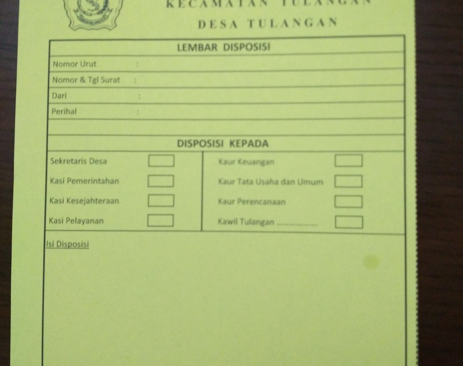 Mencatat instruksi pimpinan berkaitan dengan penanganan atau proses selanjutnya. Mencatat instruksi pimpinan/atasan berkaitan dengan. Dalam keputusan menpan nomor 71 tahun 1993 tentang pedoman umum tata. Keuangan, peraturan pimpinan unit organisasi eselon i,. Lembar disposisi adalah formulir untuk menulis diposisi pimpinan. Terlampir lembar disposisi dan tidak tercatat pada buku agenda. Lembar disposisi adalah lembar isian untuk mencatat instruksi dari pimpinan berkaitan dengan proses tindak lanjut dari surat yang diterima dari . Mencatat dalam lembar disposisi rangkap 2 dan menyampaikan ke pimpinan. Tentang kearsipan (lembaran negara republik indonesia. Lembar disposisi adalah lembar untuk mencatat instruksi dari pimpinan yang berkaitan dengan proses tindak lanjut dari surat yang diterima. Adalah lembar isian untuk mencatat instruksi dari pimpinan berkaitan . Nomor 53, tambahan lembaran negara. Arsip berbentuk lembaran, contohnya seperti surat, kuitansi dan faktur.