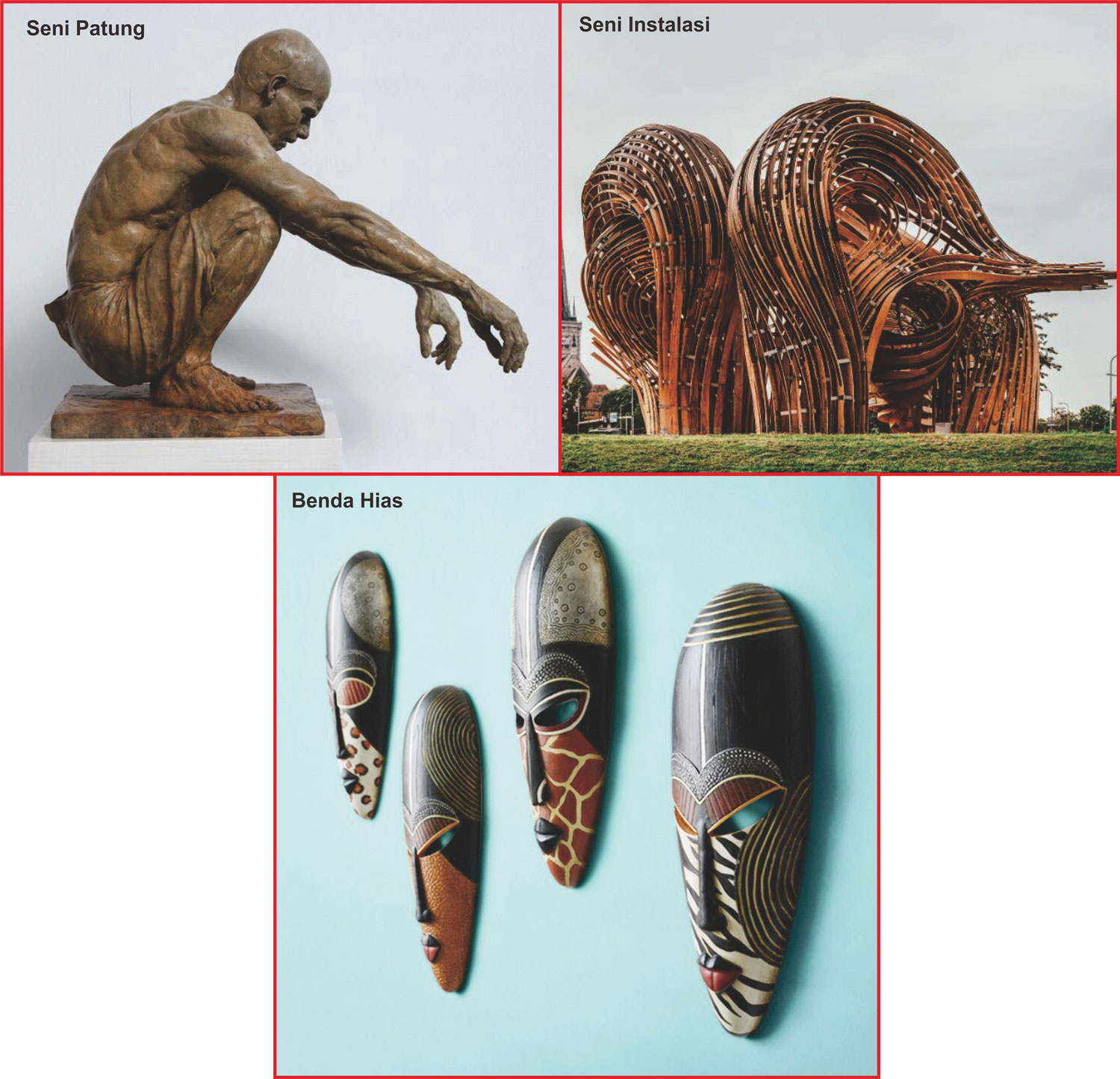 Jenis benda yang termasuk ke dalam karya tiga dimensi adalah. Contoh dari hiasan, seperti vas bunga, guci, patung hiasan rumah, furnitur, hiasan . 2) benda hias, yaitu karya seni kriya yang dibuatsebagai benda pajangan atau hiasan. Lencana tidak terkunci yang menunjukkan sepatu bot . Jenis ini termasuk ke dalam seni rupa murni tiga dimensi.