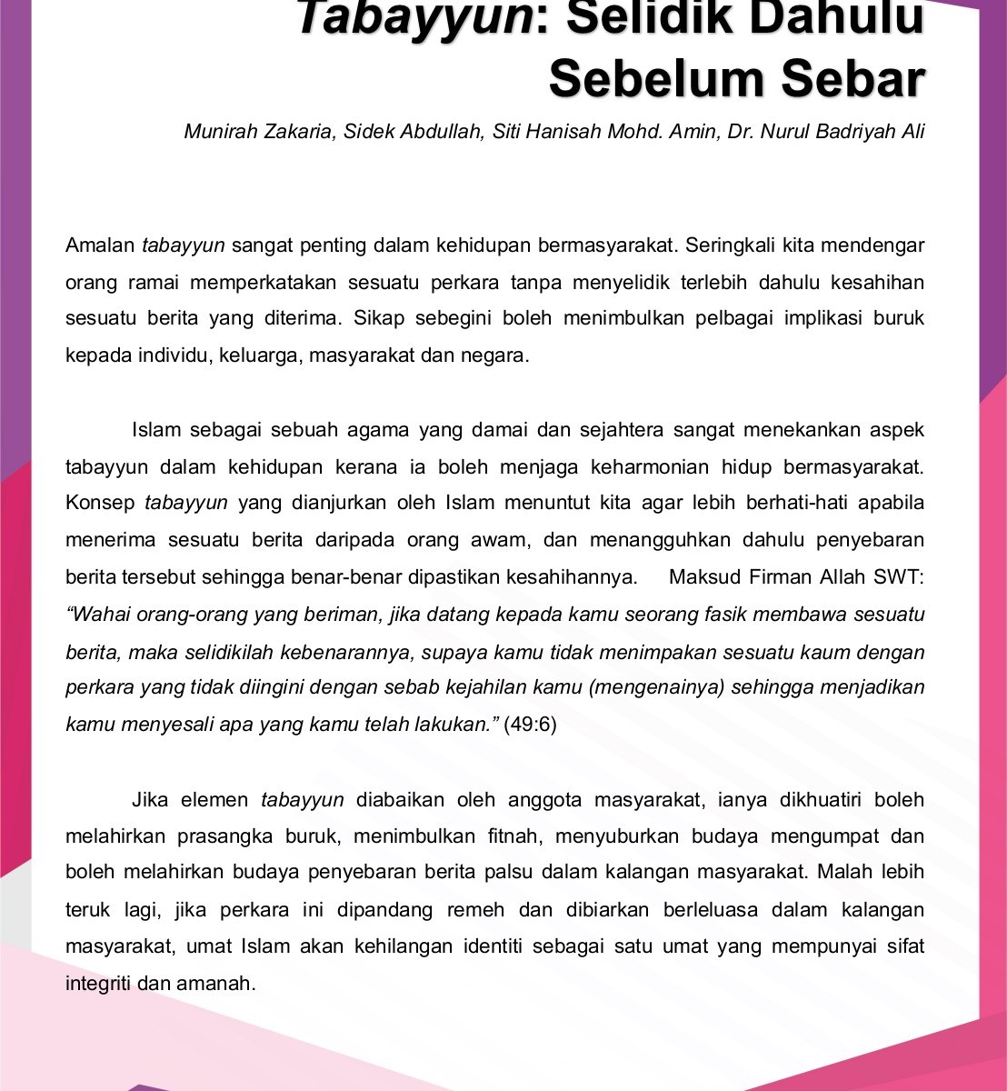 Salah satu indikator ketakwaan seseorang firman allah swt. Surat al hujurat ayat 12 adalah salah satu ayat tentang prasangka baik dan etika. Dalil naqli yang menjelaskan bahwa sebagian prasangka itu dosa adalah surah al hujurat ayat ke 12. Sesungguhnya prasangka (buruk) itu adalah dosa.”. Sesungguhnya sebagian dari prasangka itu adalah dosa dan janganlah.