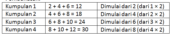Temukan tiga bilangan genap berurutan yang jumlahnya sama dengan 300. Jumlah tiga bilangan ganjil berurutan adalah 459 maka jumlah bilangan terbesar dan terkecilnya adalah misal ketiga bilangan ganjil itu : Jadi, jawabannya adalah bilangan ganjil berurutan yang jumlahnya sama dengan 135, yaitu … , … , dan … 3. Tentukan 3 bilangan selanjutnya dari pola barisan bilangan berikut ini. Soal diatas dapat dikategorikan dalam hasil .