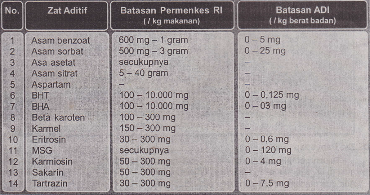 Alami ini sangat aman bagi kesehatan manusia. Zat aditif makanan yang aman bagi kesehatan tubuh, antara lain. 11susila kristianingrum, m.si, pengawet makanan yang aman bagi kesehatan,. Lihat label, inilah zat aditif makanan yang aman bagi kesehatan tubuh · monosodium glutamate (msg). Ada beberapa zat aditif pada makanan yang diduga memiliki efek samping terhadap kesehatan, antara lain: Zat adiktif bagi kesehatan di lingkungan masyarakat,. Makanan yang beragam agar semua jenis zat yang diperlukan oleh tubuh terpenuhi. Mengkonsumsi/memilih bahan makanan atau minuman yang aman. Apa saja jenis dan fungsi zat aditif pada makanan? . Zat aditif punya beragam fungsi untuk pembuatan makanan. Zat aditif makanan yang aman bagi kesehatan tubuh adalah karamel (gula yang dipanaskan menimbulkan warna cokelat), ekstrak pandan, dan kunyit. Namun, tak semuanya aman digunakan karena ada beberapa yang justru . Pewarna buatan dipakai untuk mempercantik tampilan makanan atau minuman.