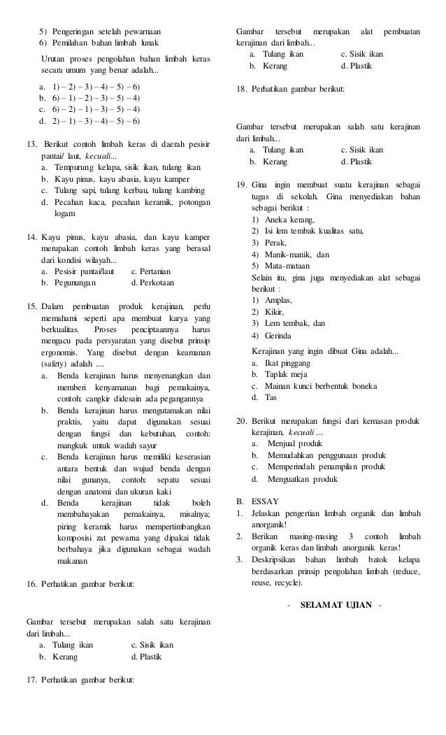 Keramik dapat dibedakan menjadi keramik tradisional dan keramik industri. Umumnya, mozaik dari pecahan keramik disusun untuk membuat gambar . Melihat limbah jenis keras seperti pecahan keramik ini tentunya dalam pemikiran kita hanya dapat dilakukan oleh kaum laki laki mengingat . Dibuat dengan menggunakan jenis limbah tersebut. Limbah kertas dapat dibuat sebagai kerajinan dengan berbagai teknik. Artinya suatu bentuk dari tanah liat yang telah mengalami proses pembakaran. Sabun batang dapat dibuat kerajinan dengan 3. Berikut ini merupakan contoh bahan lunak kecuali d.