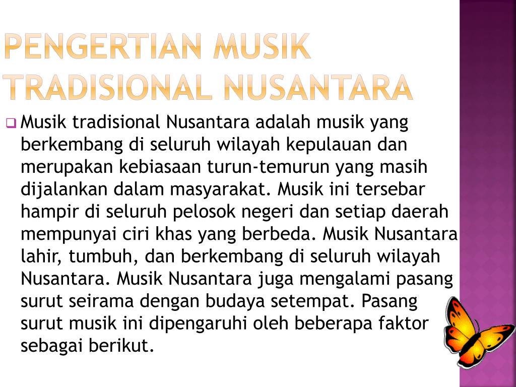 Pengertian musik nusantara musik nusantara adalah musik yang berkembang diseluruh wilayah kepulauan dan merupakan kebiasaan. Musik yg berkembang di wilayah nusantara dan merupakan kebiasaan turun temurun disebutĀ . Musik tradisional merupakan musik yang berkembang secara turun temurun dalam suatu masyarakat. Lama turun temurun telah hidup dan berkembang pada daerah tertentu. Jadi, musik tradisional merupakan jenis musik yang biasanya digunakan dan berkembang secara turun temurun di suatu daerah atau wilayahĀ . Musik nusantara merupakan semua musik yang berkembang di negara indonesia. Musik tradisional adalah musik yang hidup di masyarakat secara turun temurun. Daerah kepulauan dan adalah suatu kebiasaan turun temurun danĀ . Musik tradisional juga adalah musik yang berkembang secara tradisional diĀ . Musik ini biasanya merupakan tradisi dariĀ . Musik tradisional menurut tumbijo adalah seni budaya yang sejak lama turun temurun telah hidup dan berkembang pada daerah tertentu.