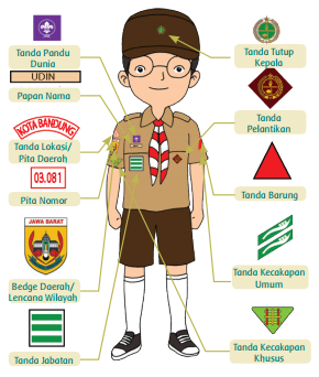 Dipasang di lengan baju pramuka sebelah kanan, di bawah tanda gudep. Warna dasar coklat tua dan lambang gerakan pramuka berwarna kuning emas diatasnya. Tanda ini di pasang di lengan sebelah kiri baju seragam pramuka. Tanda ini dipasang pada ujung kerah baju sebelah kanan. Dikenakan pada lidah bahu baju seragam pramuka sebelah kanan dan kiri.