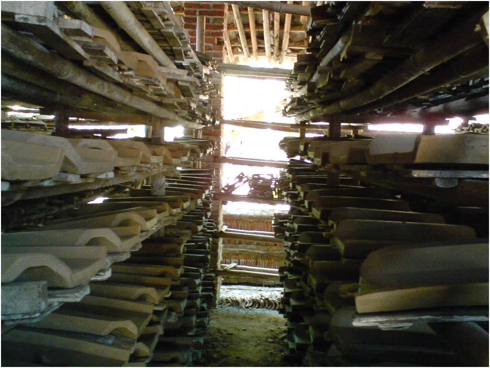 Proses pembakaran genting setelah dicetak. Pengeringan oven berlangsung selama dua hari. Yang sedang di jemur, bongkahan genting dan tungku pembakaran bahkan mendengarkan proses selep . Tahapan selanjutnya adalah proses pengeringan. Proses pengeringan genting yg sudah di cetak dalam tungku berlangsung selama .
