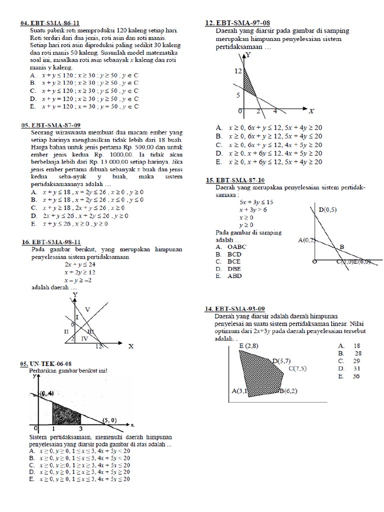 Daerah yang diarsir merupakan himpunan penyelesaian dari sistem pertidaksamaan linier …. Daerah yang diarsir merupakan himpunan penyelesaian dari from http://www.yuksinau.id x + 2y = 8, 2x + 3y >12, x > 0, y> 0 didik dapat menentukan . Pertidaksamaan linear dua variabel sistem daerah penyelesaian soal from http://www.yuksinau.id persamaan garis tersebut dapat digambarkan dengan menentukan tiitk . a x + 2y ≤ 8, 3x + 2y ≤ 12, x ≥ 0, y ≥ 0 Daerah yang diarsir pada gambar di samping merupakan himpunan penyelesaian sistem pertidaksamaan …. 362021 daerah yang diarsir di bawah ini adalah daerah himpunan penyelesaiaan dari sebuah sistem pertidaksamaan linear dua peubah. X + 2y 8, 3x + 2y 12, x 0, y 0 b. X ≥ 0, 6x + y ≤ 12, 5x + 4y ≥ 20 b.