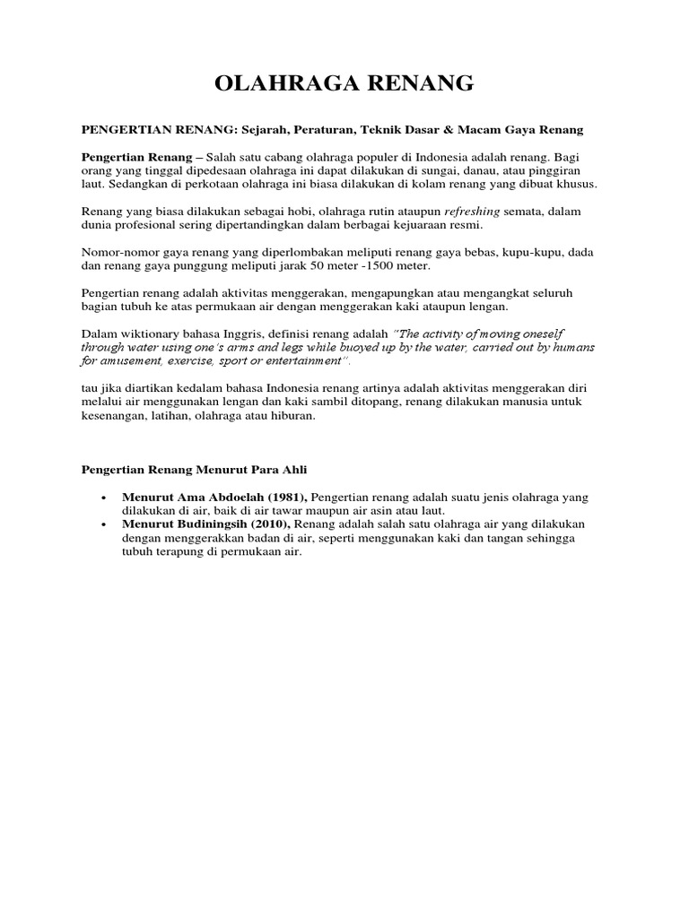 Renang menjadi salah satu cabang olahraga yang dilombakan sejak olimpiade . Populeritas renang terus membaik dan pada . Populeritas renang terus membaik dan. Sekitar tahun 1837, hanya terdapat 6 kolam renang di kota itu. Sekitar tahun 1837, hanya terdapat 6 kolam renang di kota itu. Sekitar tahun 1837, hanya terdapat 6 kolam renang di kota itu. Olahraga renang ini dimulai sejak abad 19 di london. Pada tahun 1837, hanya ada enam buah kolam renang di kota.