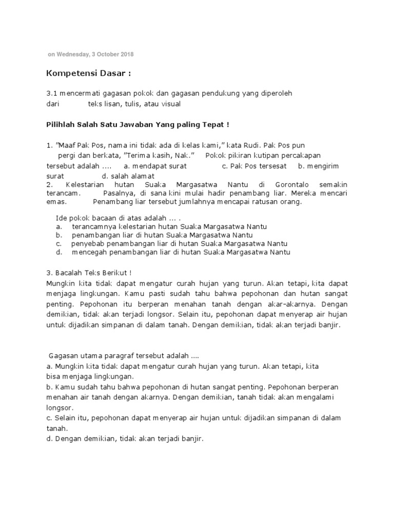 Kelompok mengenai gagasan pokok dan gagasan pendukung tiap paragraf (bertanya dan mengkomunikasikan). Berikut utlislah gagasan pokok dan gagasan pendukung dari bacaan tong sampah gotong royong pada tema 1 kelas 4 sd dan mi halaman 106. Berikut perbedaan gagasan pokok dan gagasan pendukung. Dapat mengidentifikasi gagasan pokok setiap paragraf dari teks tulis dengan mandiri. Gagasan pokok …
