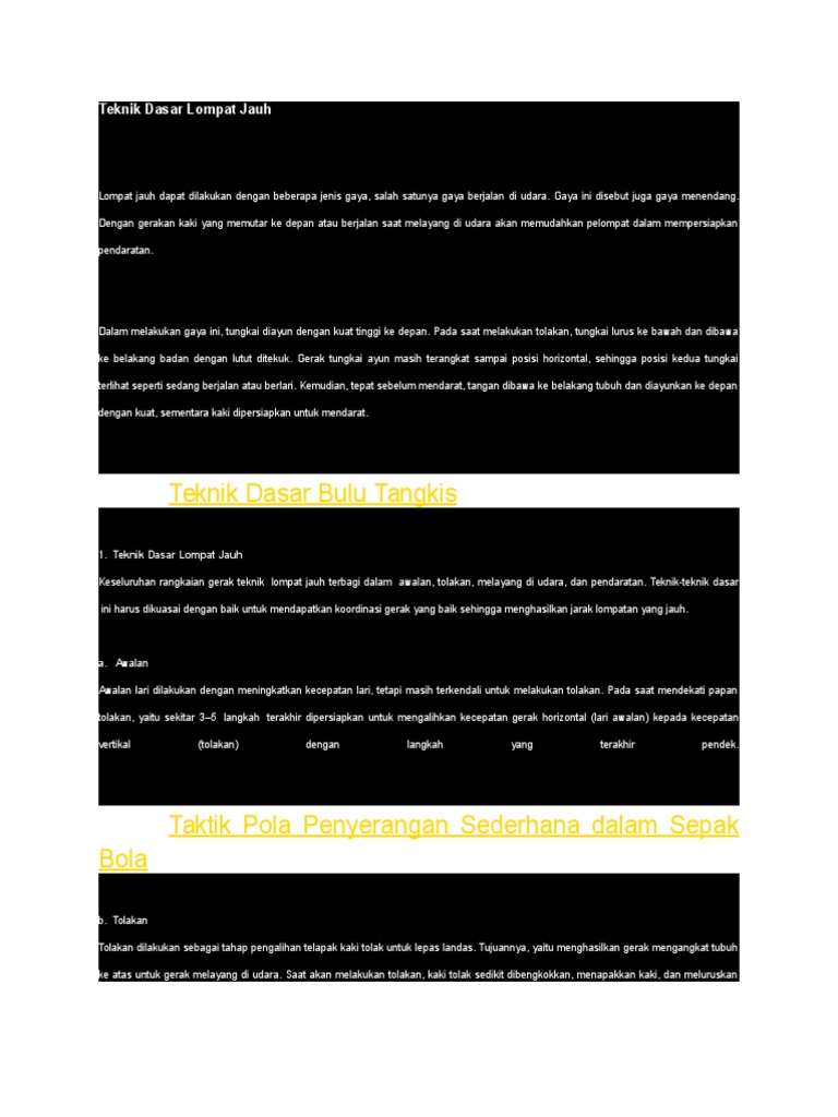 Awalan, tolakan, sikap badan di udara melayang) dan mendarat. Sejauh mungkin ke bagian letak pendaratan atau bak lompat. Saat melayang, tekuk kedua kaki sedikit sehingga badan berada dalam sikap jongkok. Dalam lompat jauh terdapat beberapa macam gaya atau sikap badan pada saat. Kelima, saat akan mendarat acungkan kedua kaki ke depan, . Posisi badan saat lari yang paling benar adalah. Agar tidak menyentuh mistar lompatan. Dalam lompat jauh, pendaratan dilakukan dengan kedua kaki secara bersamaan. Posisi badan ketika mendarat pada lompat jauh sebaiknya. Pendaratan, pada waktu akan mendarat berat badan dibawa ke depan, begitu. Sikap badan di udara dalam lompat jauh gaya jongkok adalah posisi. 4.3.1 mengidentifikasi kesalahan dalam ketegori gerak lompat ( jauh ). Salah satu gaya dalam lompat tinggi adalah gaya straddle atau.