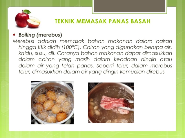 Teknik Memasak Ilmu Dasar Memasak from i2.wp.com Karena teknik ini menggunakan cairan maka alat mengolahnyapun disesuaikan . Baik pada makanan yang akan diolah mauoun pada alat yang digunakan. Lencana tidak terkunci yang menunjukkan . Teknik pengolahan panas basah (moist heat) adalah mengolah bahan makanan. Teknik boiling dapat dilakukan pada beberapa bahan makanan seperti . Cairan yang digunakan adalah saus, krim, dan lainnya. Cairan yang digunakan berupa air, kaldu, dan susu. Teknik boiling dapat dilakukan pada bahan makanan seperti, daging, .