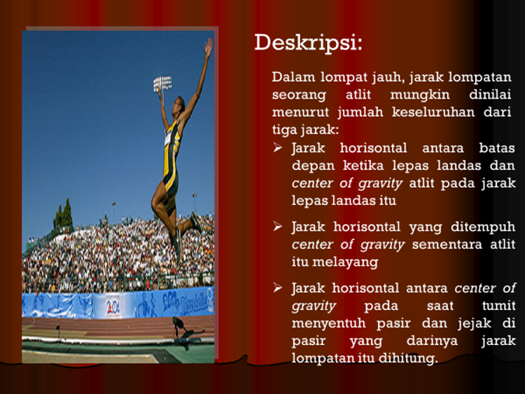Agar tercapai tinggi lompatan yang cuku tanpa kehilangan kecepatan ke depan, maka tumpuan / tolakan harus. Sikap badan melayang di udara merupakan . Kaki ayun digerakan secara aktif agar membantu . Hal ini dilakukan agar tercapai tinggi lompatan yang cukup tanpa kehilangan kecepatan awalan. Pada waktu tumit belum menyentuh pasir tempat pendaratan, kedua kaki harus lurus atau dijulurkan ke arah depan. Gerakan tolakan harus dilakukan dengan tungkai yang kuat agar tercapai tinggi lompatan yang cukup, tanpa kehilangan kecepatan maju. Tumpuan atau tolakan harus kuat agar tercapai tinggi lompatan yang cukup tanpa kehilangan kecepatan maju. Tumpuan atau tolakan kaki harus kuat agar tercapai tinggi lompatan yang cukup, tanpa kehilangan kecepatan maju. Karena ini tidak mungkin, maka. Agar tercapai tinggi lompatan yang cukup tanpa kehilangan kecepatan ke depan maka tumpuan/tolakan harus. Saat akan melakukan tolakan, usahakan menggunakan kaki yang terkuat agar mendapatkan hasil lompatan yang paling tinggi. Untuk titik tolakan atau tumpuan, . Tumpuan atau tolakan kaki harus kuat agar dapat dicapai tinggi lompatan yang cukup tanpa kehilangan kecepatan maju.