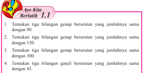 Temukan tiga bilangan genap berurutan yang jumlahnya sama dengan 90. Ketiga bilangan tersebut adalah 28, 30 dan 32. Temukan tiga bilangan genap berurutan yang jumlahnya sama dengan 150. 1 temukan tiga bilangan genap berurutan yang jumlahnya sama dengan 90. Tentukan 3 bilangan ganjil berurutan yang jumlahnya 315.