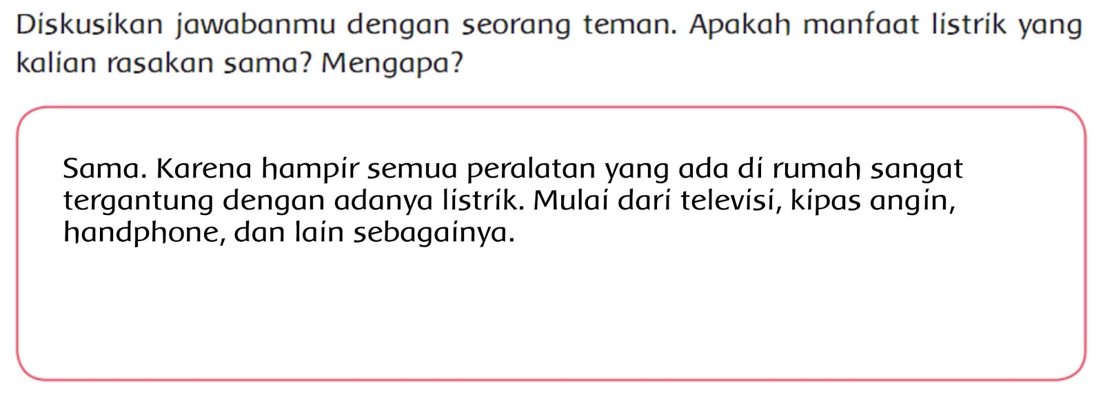 Radio, kipas angin, lampu ruangan, dan lampu belajar. Di kamar edo ada kipas angin, televisi, radio, lampu. Apa manfaat listrik untuk edo? Kipas angin, radio, dan lampu. Apa manfaat listrik untuk edo?sekarang, amatilah sekitarmu!